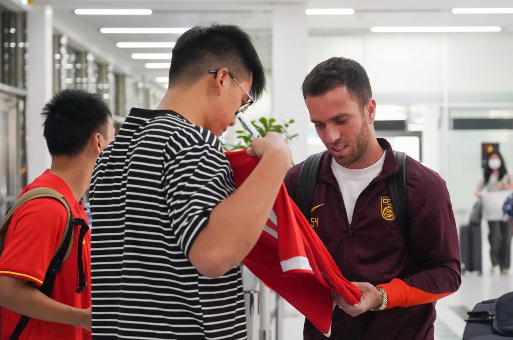 3月17日,中国队球员塞尔吉尼奥(右)在利雅得哈立德国王机场为球迷签名。新华社记者 罗晨 摄