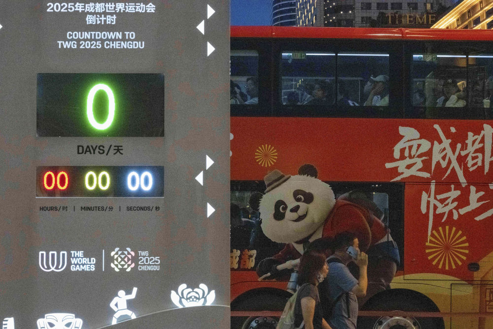 ↑8月7日,在成都天府广场,人们走过世运会倒计时牌。新华社记者谢剑飞摄