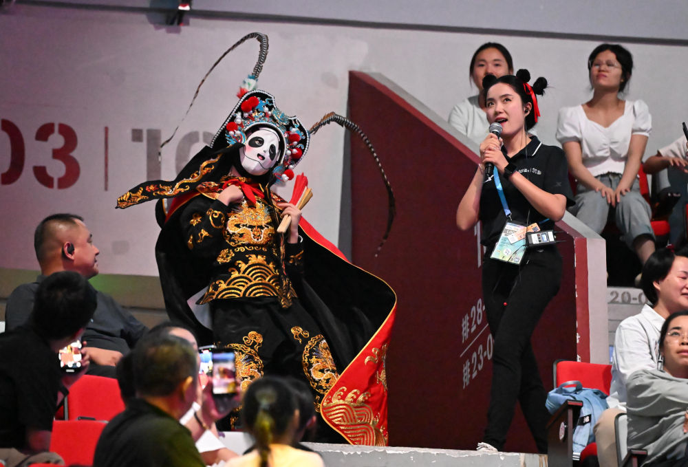 ↑8月10日,川剧变脸表演者在世运会蹦床比赛前暖场。新华社记者孙凡越摄
