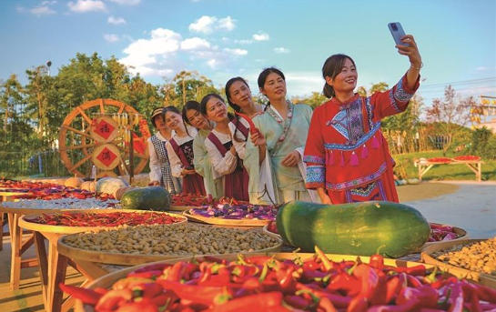 园区特别打造了“田间T台”互动环节。伴着轻快旋律,身着布依族服饰的游客们利用辣椒、红枣、玉米等作物,亲手制作成项链、裙饰等自然服饰,并自信登台走秀,参与五彩晒秋等趣味活动。每一个动作、每一张笑脸,皆是对农耕文明的深情致敬,亦为美好生活写下生动注脚。“第一次参与‘田间T台’,真切体会到丰收的喜悦,这趟旅程格外有意义。”游客王女士欣喜地分享。