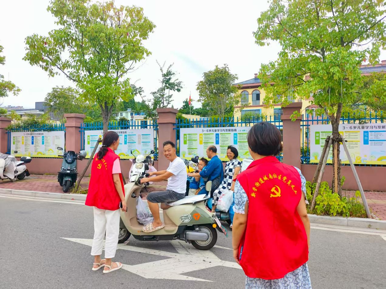社区党员义工在城南幼儿园前劝阻交通