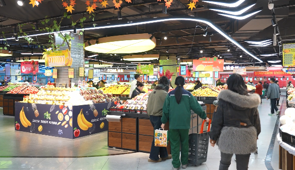 市民吴晓丽推着满满一车商品,里面装满了孩子爱吃的零食、家人爱喝的饮料和招待客人的水果。“超市里的节日氛围特别浓,商品种类齐全,价格也实惠。今年超市货源特别足,想买的东西都能买到,而且我还对比了一下,今年的年货价格和平时差不多。此外超市还推出了满减、打折活动,特别划算,特别方便。”