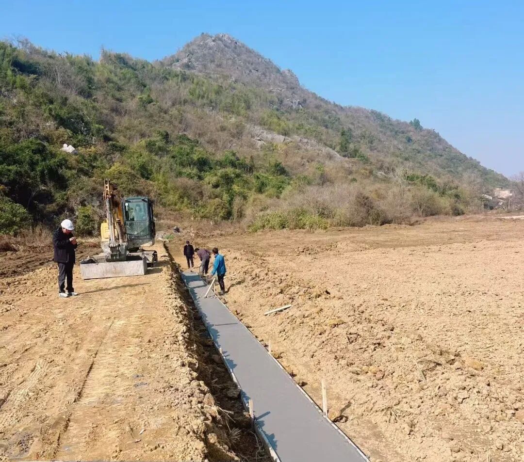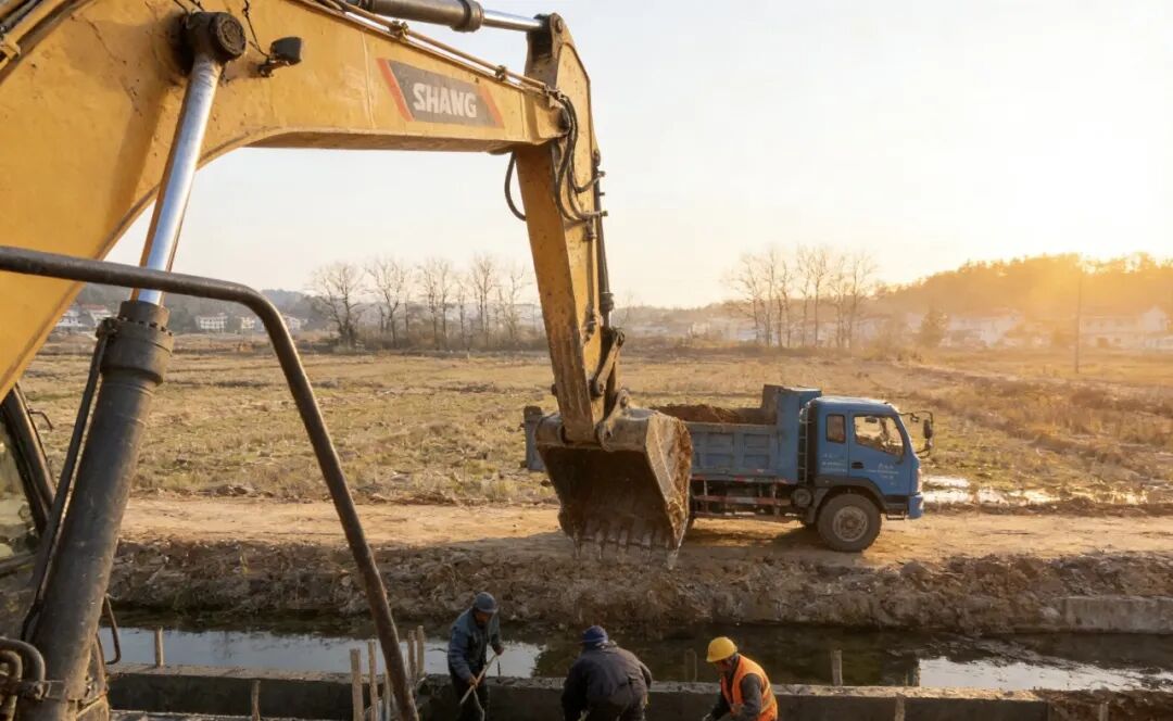 冬日暖阳下,玉山县四股桥乡四股桥村的高标准农田建设现场一派热火朝天的繁忙景象。挖掘机铁臂挥舞,来回穿梭平整土地;工程车辆满载砂石水泥,驶向田间道路修建点位;工人们正忙着衬砌灌溉水渠,一条条笔直的沟渠在田野间延伸,勾勒出稳产高产的希望轮廓。
