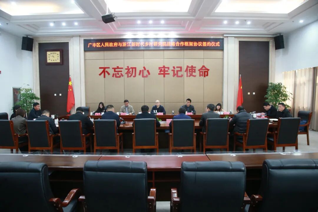 1月15日,广丰区人民政府与浙江省新时代乡村研究院战略合作框架协议签约仪式举行。浙江省新时代乡村研究院院长莫问剑出席,区委副书记陈金良致辞。浙江大学新农村发展研究院和农业试验站主任、党支部书记孙睿,浙江大学新农村发展研究院和农业试验站副主任李坤峰,浙江省新时代乡村研究院办公室主任沈梦芸、媒体部主任方铃,副区长汪学文,区政协副主席包晓辉等出席。