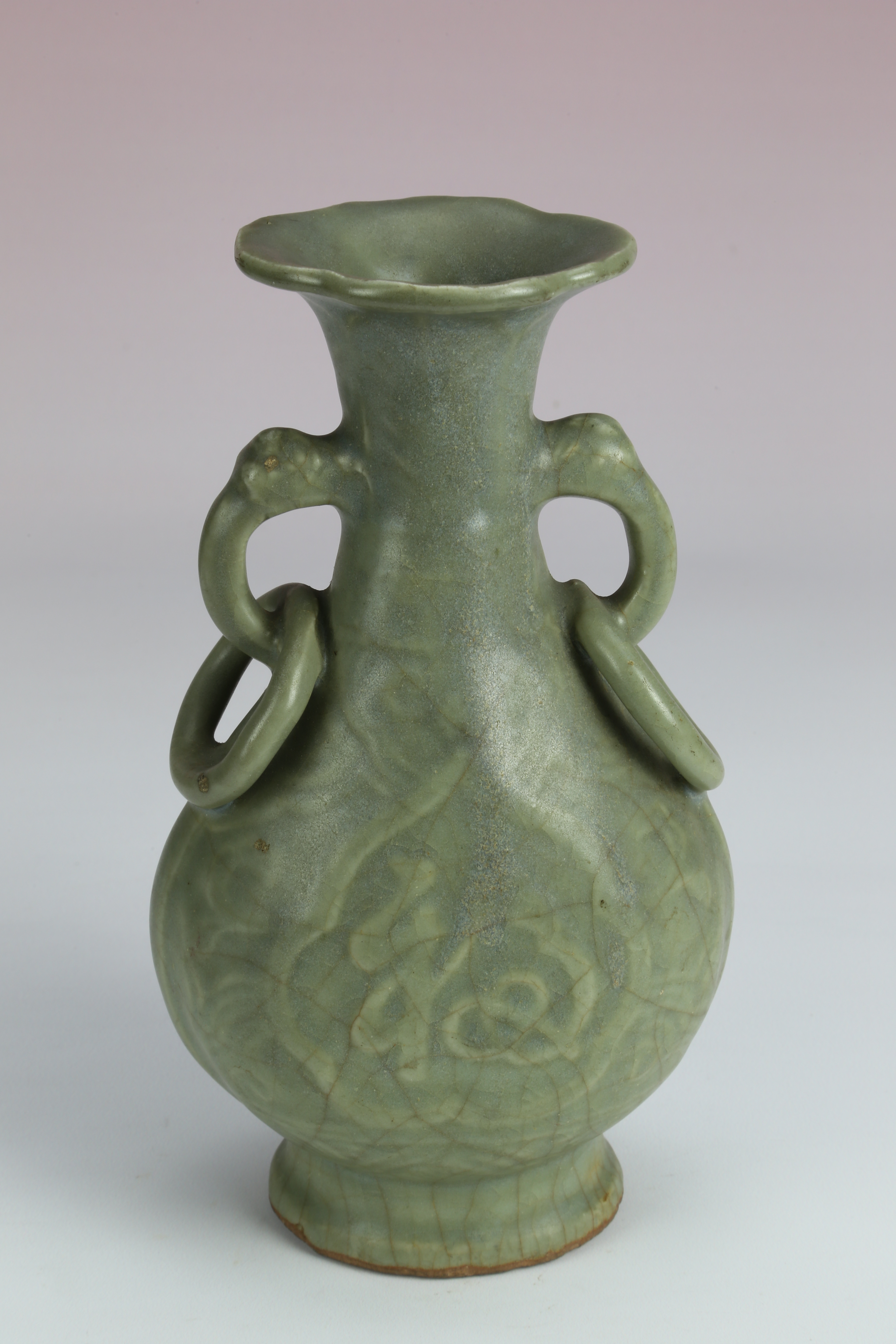 元龙泉窑青釉双耳连环福寿纹海棠形瓶(福)