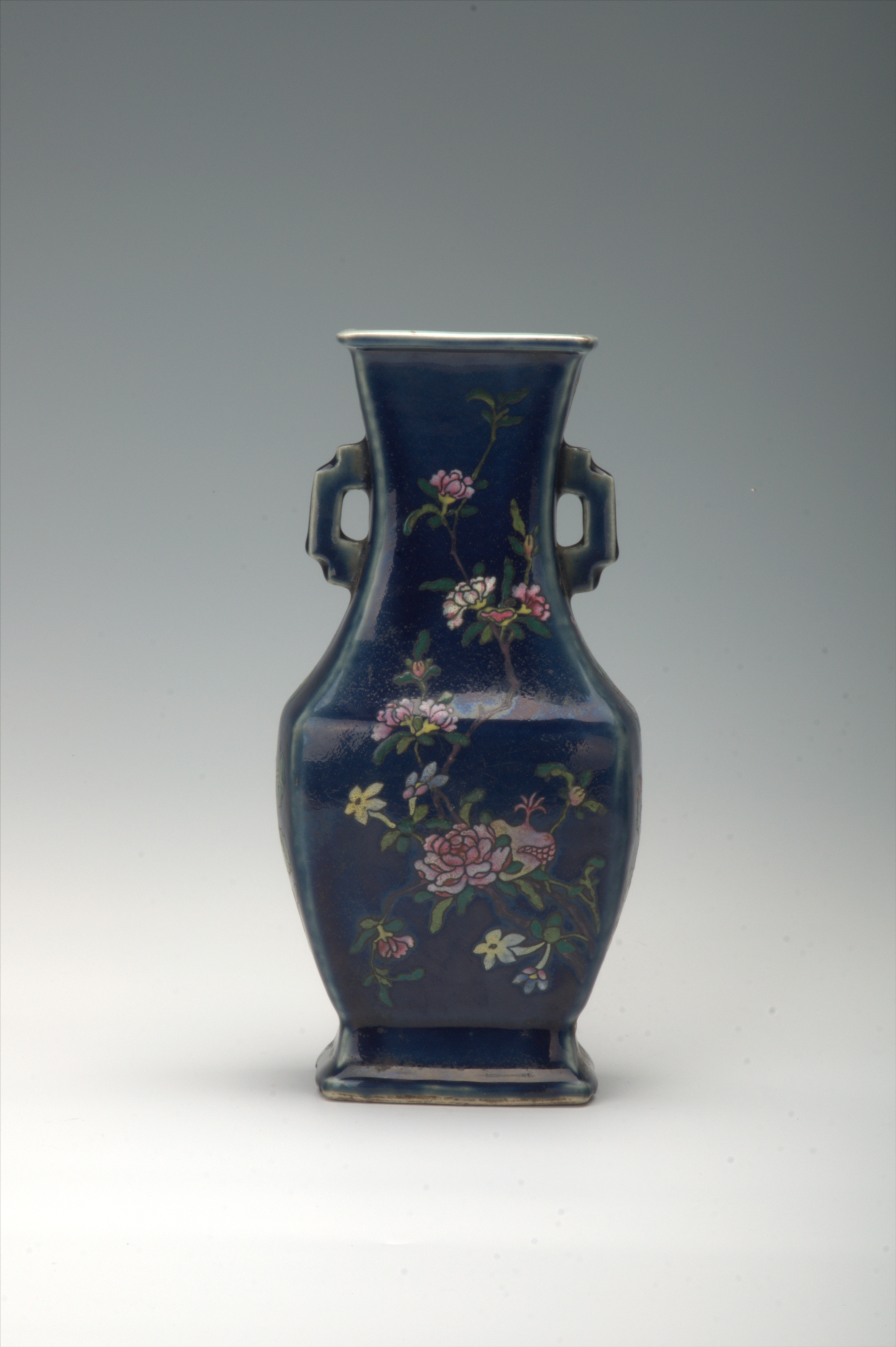 清嘉庆蓝地粉彩双耳方口瓶