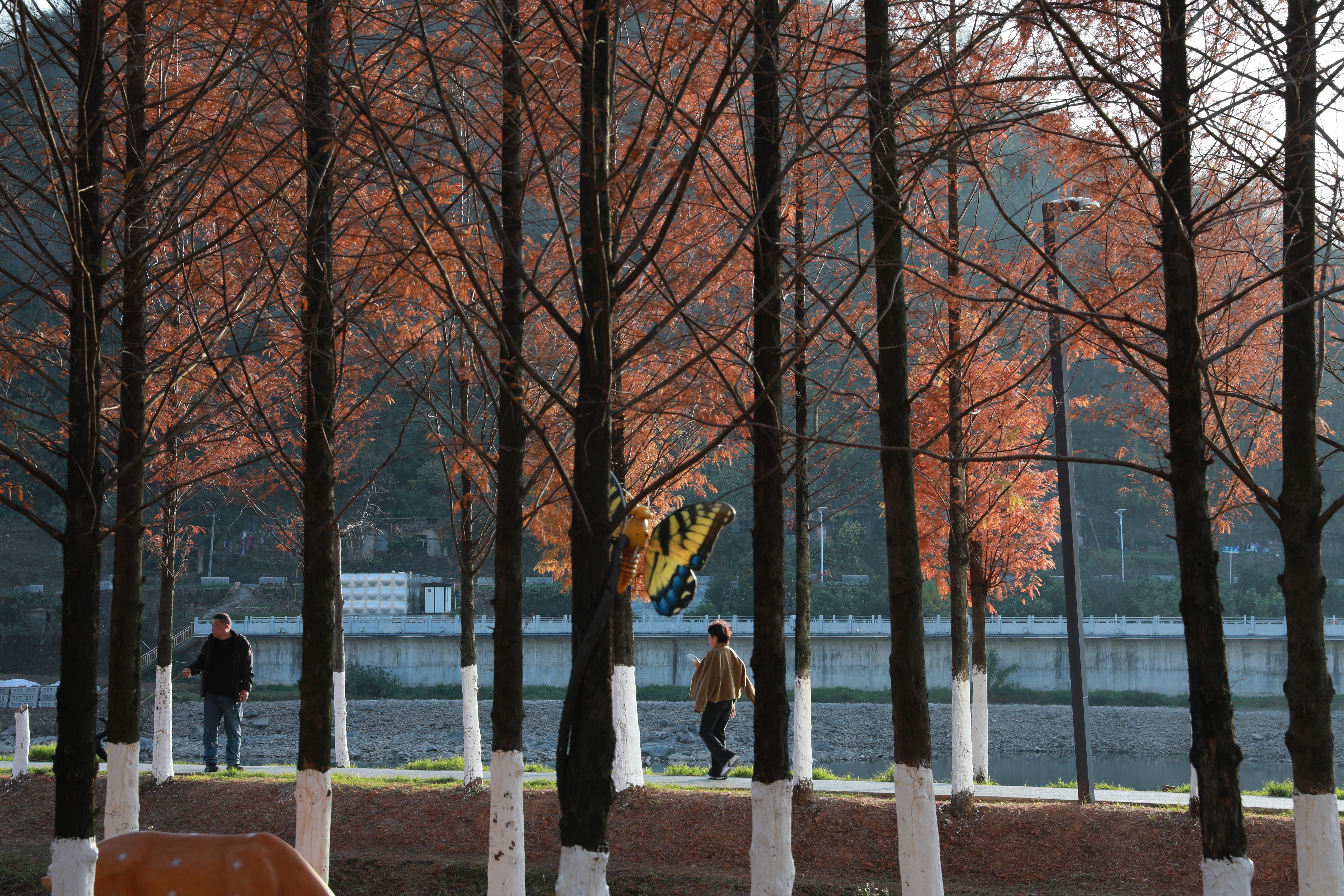走入林中,但见水杉笔直向天,似披着霞衣的守园人。阳光从枝叶间漏下,在步道上摇曳着点点金斑。风起时,林间簌簌低语,光影随之轻舞,仿佛连空气都染上了几分宁静的生动。人们在此放缓步履——有人举镜凝眸,将一树绯红裁入方寸;有人沿河徐行,任目光与波光一同流转;也有人闲坐长椅,在这片城市绿洲里,拾得一段慢下来的时光。“这儿的杉色,镜头装不下,眼睛也看不够呢。”市民王翠仙含笑说,话音里透着藏不住的眷恋。