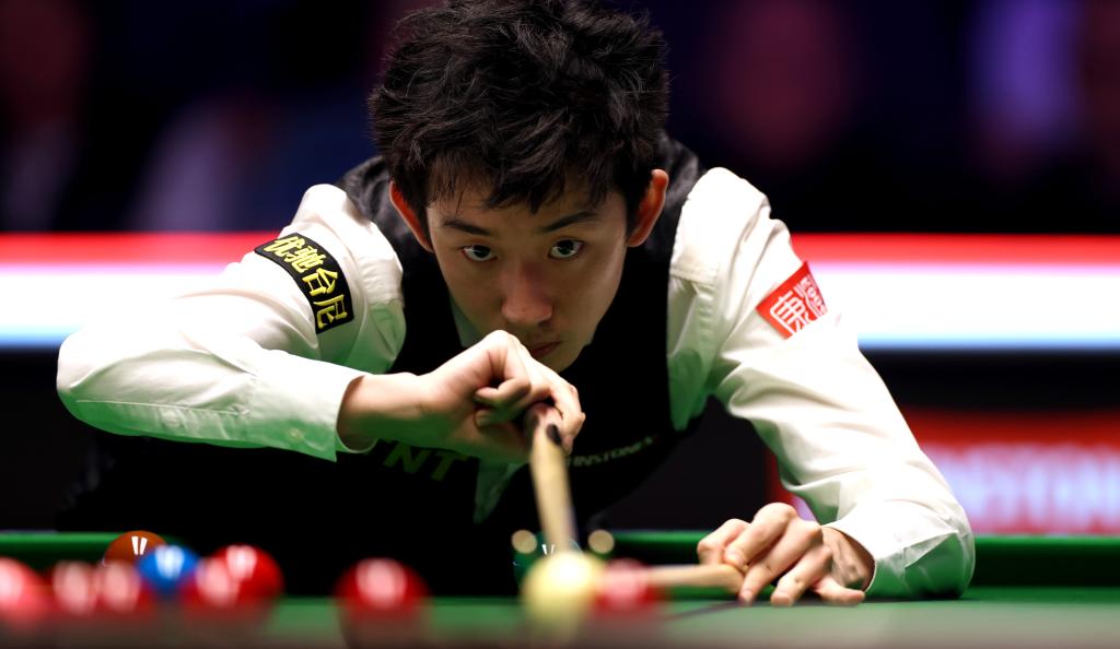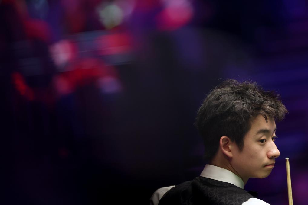 两人战成2:2平后,世界排名第二的威尔逊连下两局,以4:2领先。随后,吴宜泽找到手感,接连单杆打出74、87和58分,连扳三局,以5:4率先获得赛点。