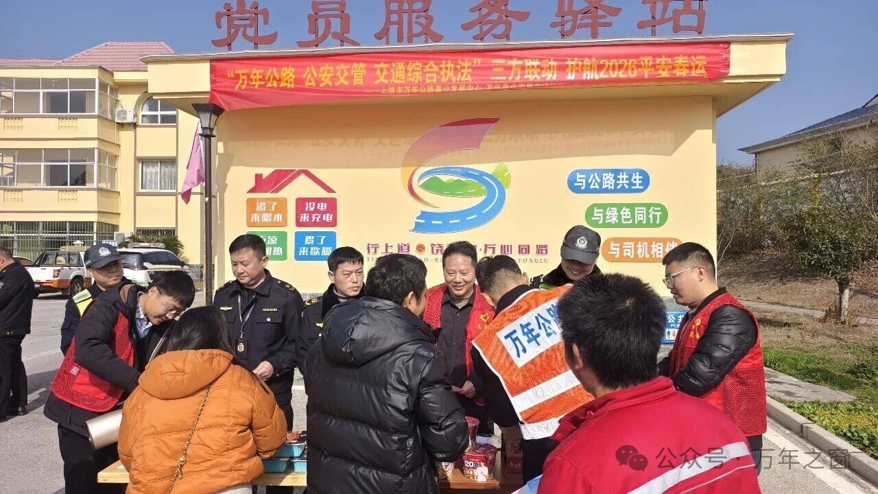 2月2日,2026年春运大幕正式拉开。在万年县齐埠公路服务区,万年公路中心、万年县公安局交通管理大队、万年县交通运输综合行政执法大队联合开展了以 “情暖春运路 护航平安行” 为主题的志愿服务活动,为南来北往的司乘人员送上 “安全+温暖” 双重保障,用实际行动守护每一位归乡人的平安旅程。