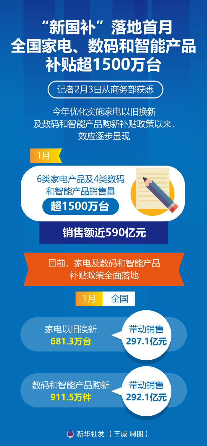 新华社北京2月3日电(记者谢希瑶)记者2月3日从商务部获悉,今年优化实施家电以旧换新及数码和智能产品购新补贴政策以来,效应逐步显现。1月,6类家电产品及4类数码和智能产品销售量超1500万台,销售额近590亿元。