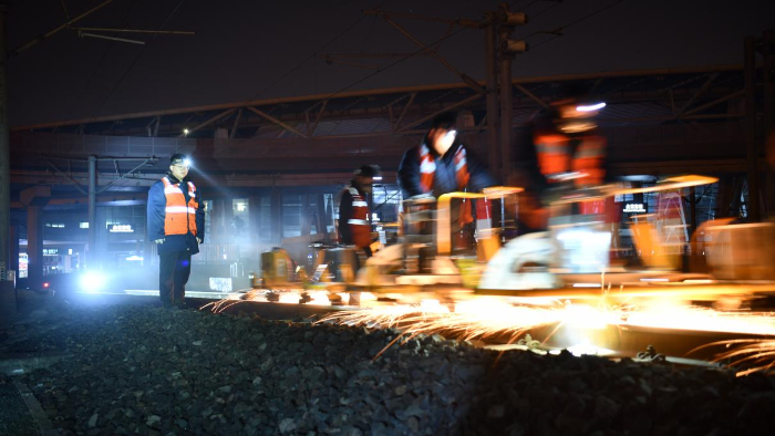 2月5日凌晨,北京南站,26岁的刘强和工友们将重达200多斤的钢轨打磨机抬上轨道。火花迸溅的瞬间,冬夜被点亮——这不是庆典烟花,而是一群“00后”铁路工人在为高铁钢轨实施“精准修整”。