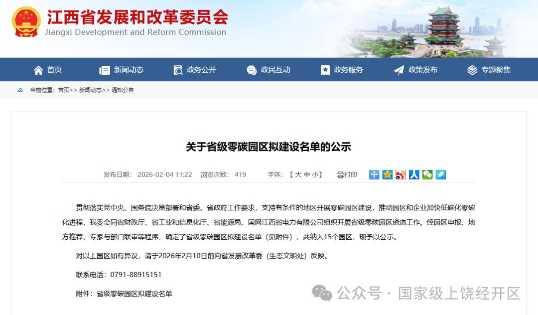 近日,江西省发展和改革委员会发布《关于省级零碳园区拟建设名单的公示》。上饶经开区成功入选标志着我区在推动绿色低碳转型和零碳体系建设上迈出坚实一步。