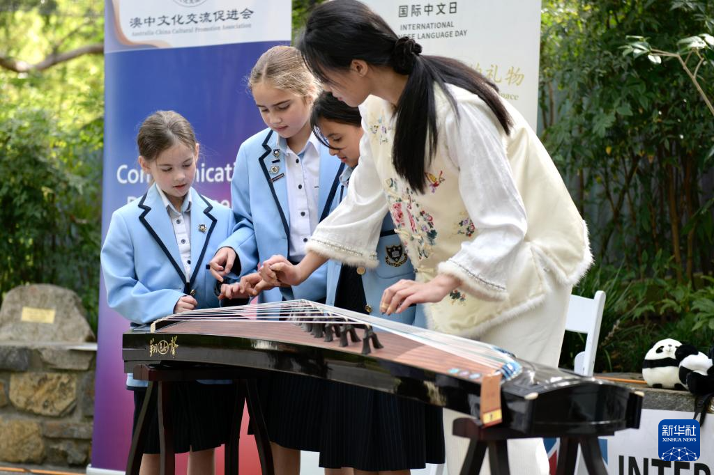 4月2日,在澳大利亚阿德莱德动物园举办的“国际中文日”活动中,来自当地学校的学生体验古筝弹奏。