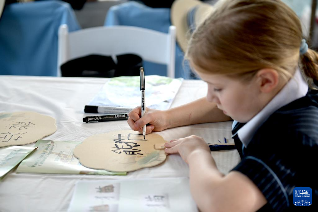 4月2日,在澳大利亚阿德莱德动物园举办的“国际中文日”活动中,一名来自当地学校的学生书写汉字“熊猫”。