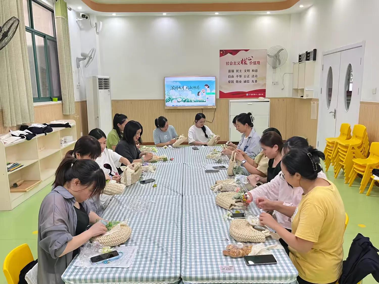 在轻松悠闲的氛围中,教师们兴致盎然,各展所长。大家充分发挥想象力与创造力,手持胶水、剪刀等工具,精心挑选花朵、小装饰品等材料,有条不紊地装饰着手中的编织包。有的教师以“秋日繁花”为主题,将不同颜色的花朵错落有致地点缀在包身;有的教师则注重简约风格,搭配少量装饰元素,展现出独特的审美品味。每一款完成的手工包都融入了教师们的创作巧思与艺术审美,别出心裁、独具匠心,成为了这个教师节最特别的“礼物”。