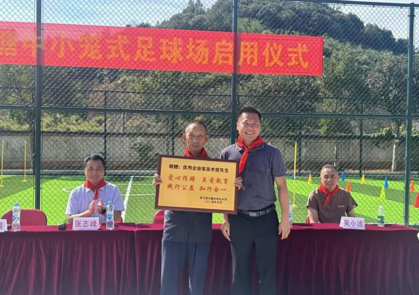 乡党委书记在仪式上发表讲话,感谢捐资家属反哺教育,肯定教学质量,寄语孩子在绿茵场强健体魄、逐梦。