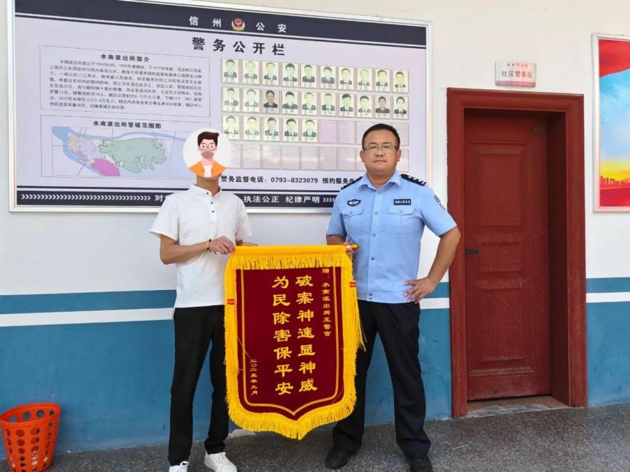 9月6日,为表达对水南派出所民警高效办案效率和热情服务态度的感激之情,陈先生特意制作了一面写有“破案神速显神威,为民除害保平安”的锦旗,送至水南派出所。“你们这办案效率太快了!真的太感谢你们了,帮我及时追回了财物。”陈先生握着民警的手,激动地说道。