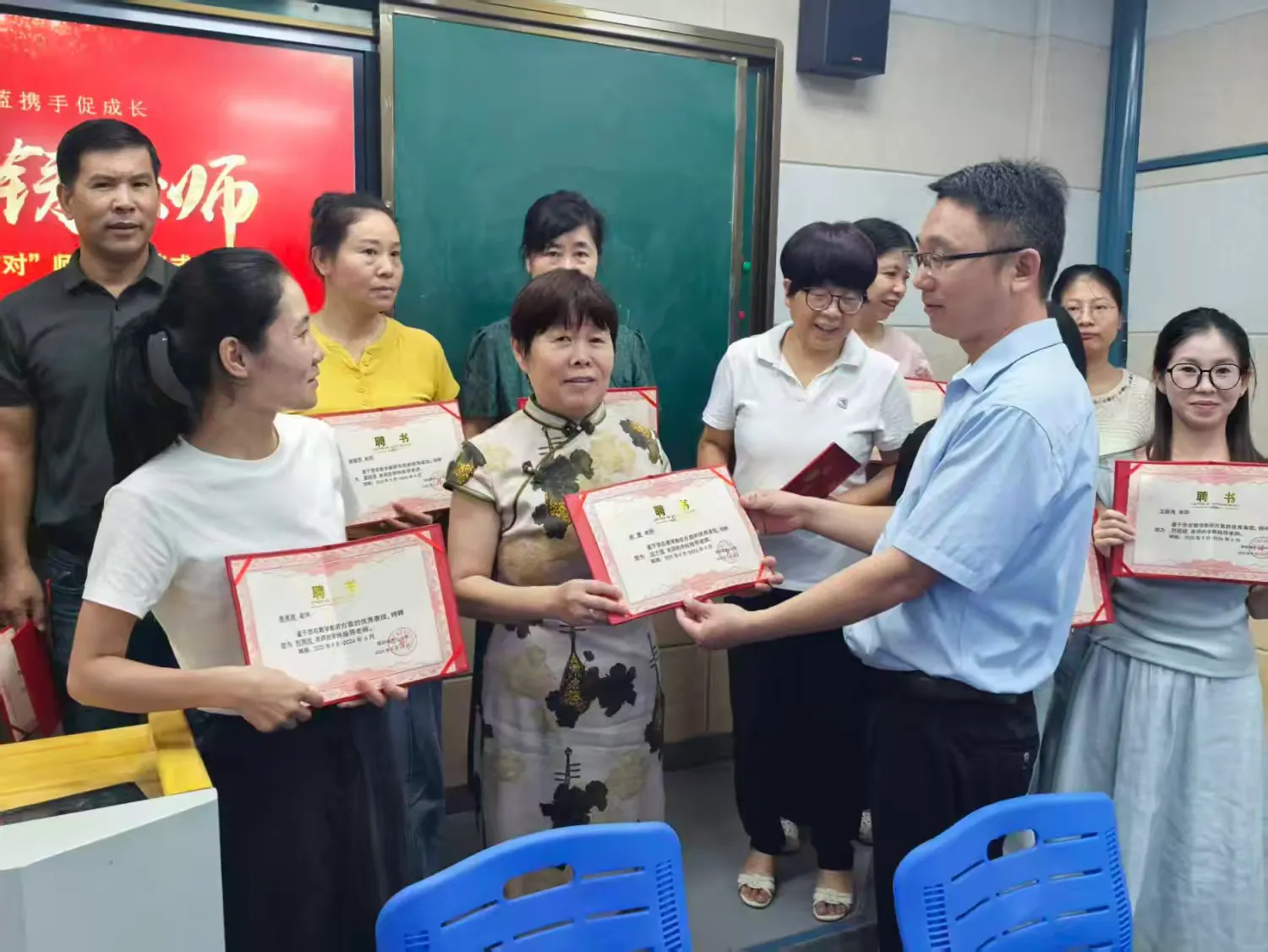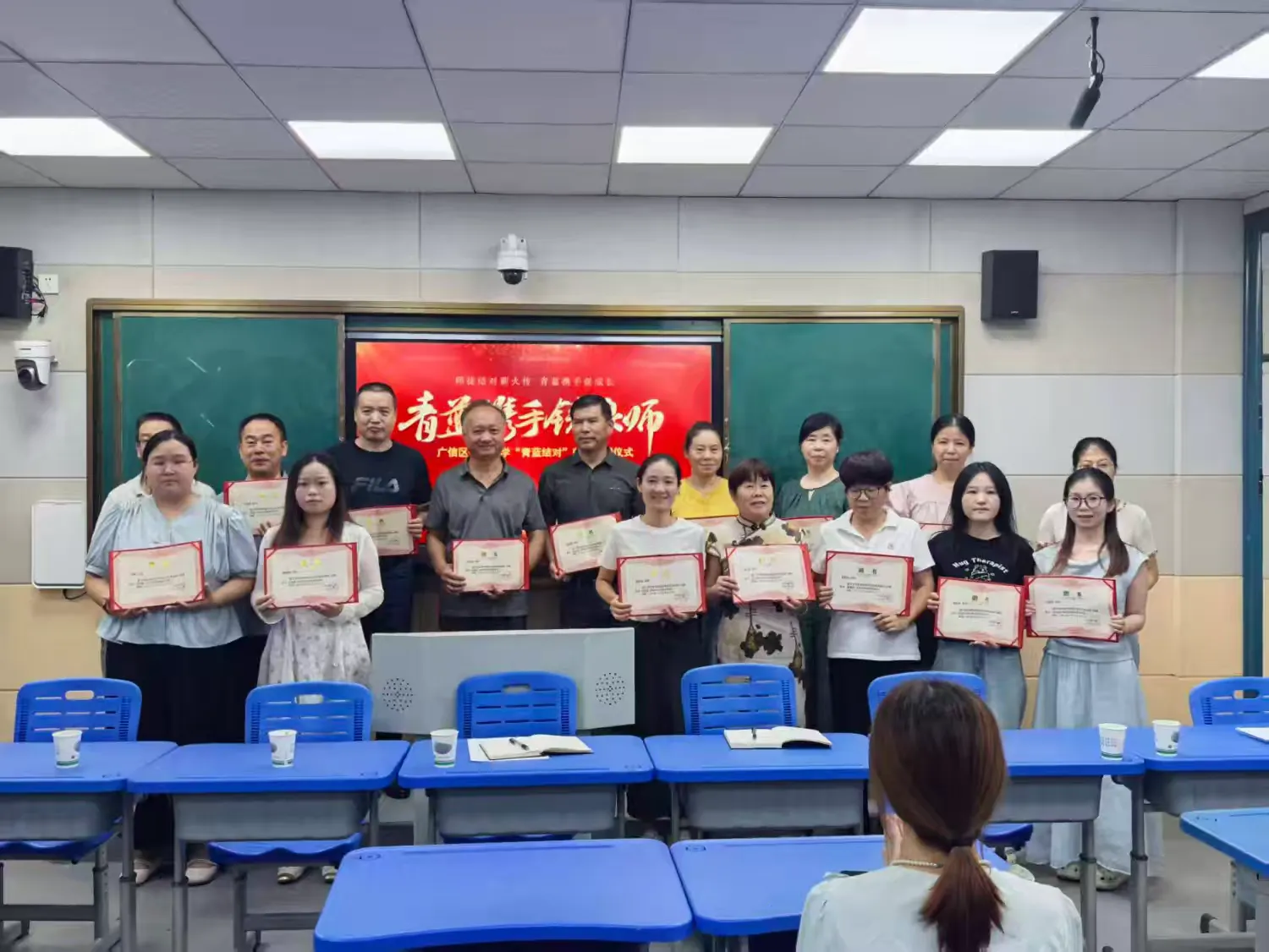 仪式现场,校领导为指导教师颁发聘书。一纸聘书承载千钧分量,既是对资深教师教学能力的认可,更寄托着学校对其履行“传帮带” 责任的信任,期待他们成为青年教师成长路上的“引路人”与“护航者”。随后,师徒双方郑重签署《“青蓝结对”协议书》,落笔间写下的不仅是师傅悉心指导、徒弟勤学善思的双向承诺,更彰显了学校对教育传承的坚守。