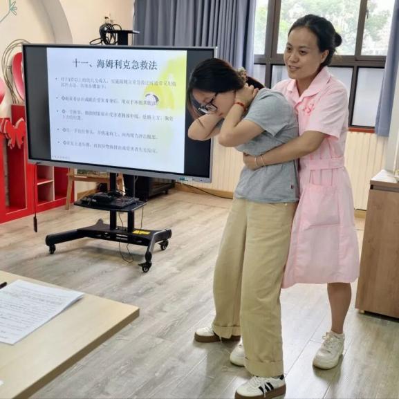 海姆立克急救法实操是本次培训的重点环节。保健医生与教职工采取“两人一组、角色扮演”的实战模式,分步演示标准操作:针对幼儿,讲解如何准确定位并实施拍背法与胸部冲击法;针对成人互救,示范背后腹部冲击动作;针对自救,指导利用椅背等物体进行应急处置。从园长到教师再到后勤人员,全员参与实操演练,在专业指导下互相切磋、纠正手法,确保每一个动作都标准规范,保障黄金救援时间内的处置效果,现场学习氛围严谨热烈。