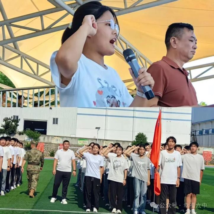 新生代表上台发言,号召全体同学以积极心态迎接军训挑战,在队列训练中磨砺意志、挑战自我,在集体生活中团结协作,让青春在汗水中绽放光芒,以坚韧精神拥抱高中旅程。随后,在新生代表带领下,全体新生面向国旗庄严宣誓。