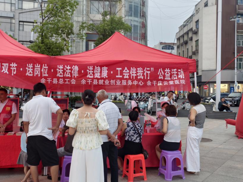 9月29日,在国庆、中秋双节来临之际,余干县总工会联合余干县就业创业服务中心、余干庆云堂医院,于琵琶湖工会驿站旁西广场举办“送岗位・送法律・送健康・工会伴我行”公益活动。活动以“暖心服务大礼包”形式,为职工群众送上节日祝福,吸引近200名职工参与,现场氛围热烈而温馨。