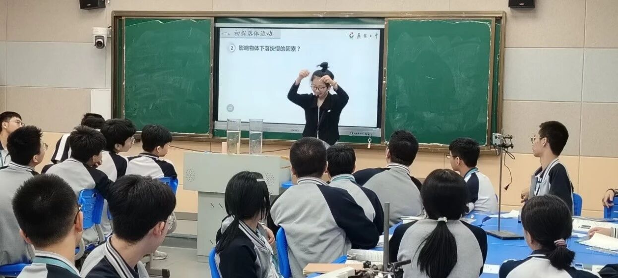 巧用信息技术,化解抽象难点。王墅老师执教课题为《自由落体运动》,她的课堂兼具趣味性与挑战性,以“名侦探柯南破解高空坠物案件”开场,迅速激发学生探究欲望。随后通过改变介质阻力系数、演示牛顿管实验,引导学生逐步探究自由落体运动规律。课堂中,她充分运用多媒体动画与仿真软件,将物体下落过程可视化、动态化,让原本难以直观观察的物理量变得清晰易懂,成功化解教学抽象难点。