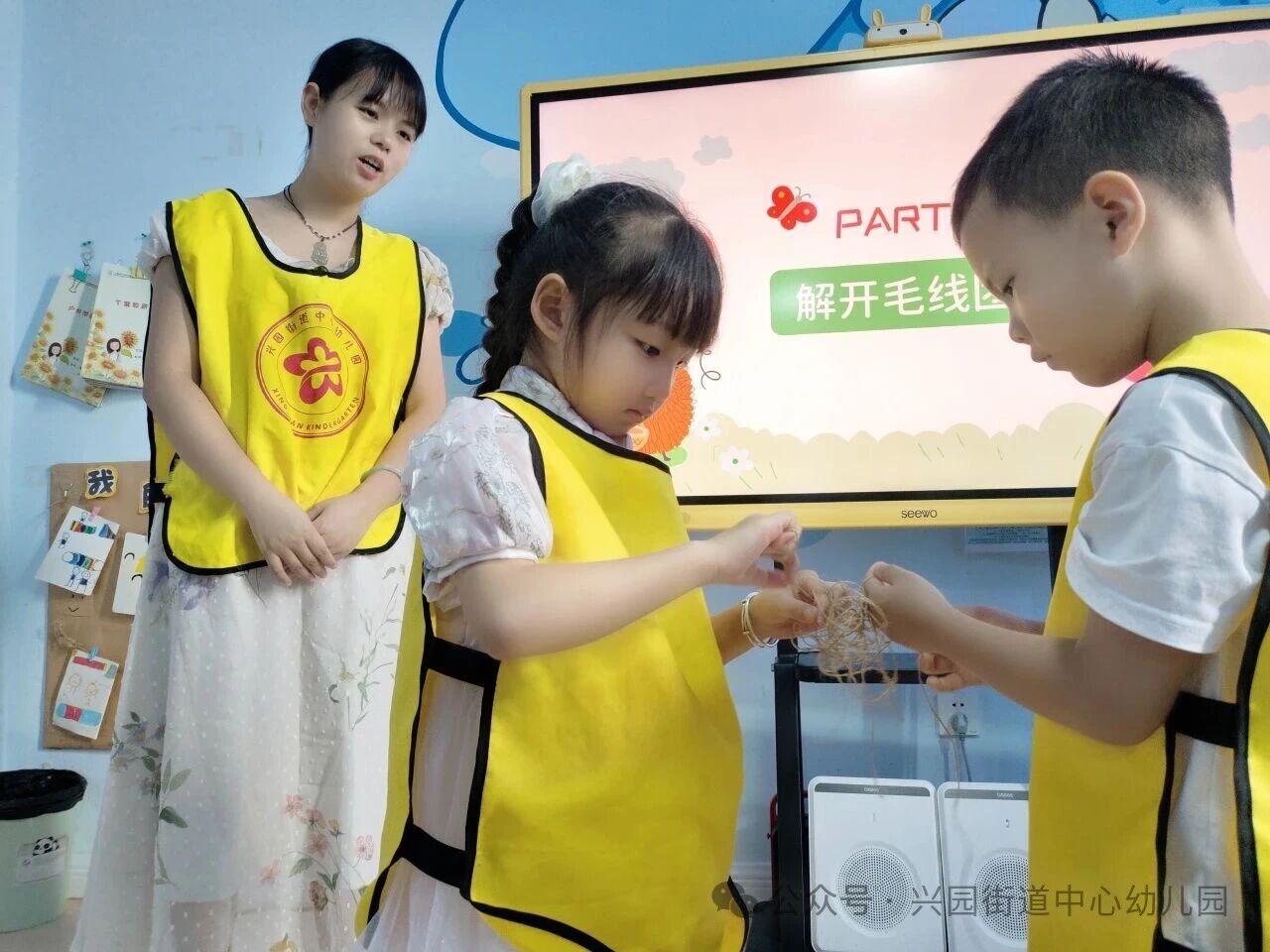 手工环节“解开毛线团”更是将课程推向高潮。孩子们小手耐心的解开“解开毛线团”,脸上有着开心、着急、期待等情绪但都被耐心给替代了。老师引导他们分享:“当你解不开毛线团的时候是什么心情,把毛线团解开又是什么心情呢?孩子们在轻松的氛围中学会识别和表达自身感受,也理解了“耐心等待会让期待的事情更美好”。