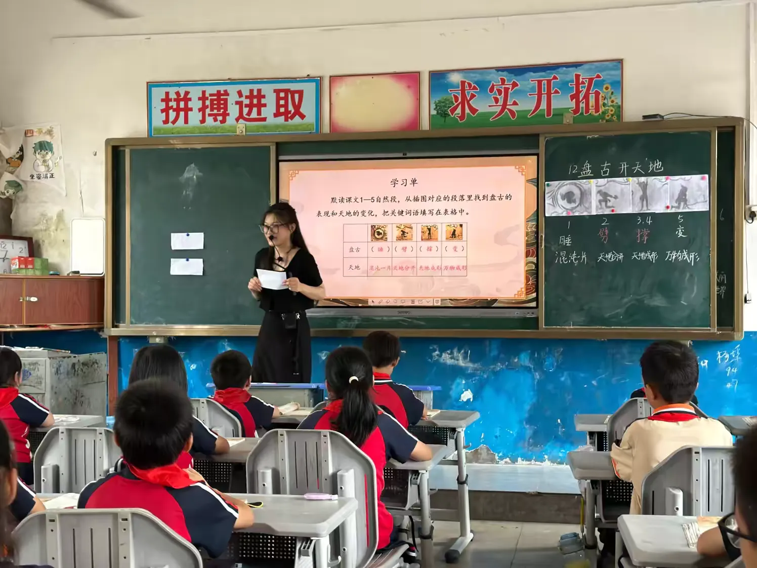活动中,授课教师精心准备,各展风采。在《盘古开天地》一课教学中,教师以“梳理盘古开天辟地的过程、感受神话的神奇想象、体会盘古的奉献精神”为核心目标,思路清晰、重点突出。通过游览“神话馆”的方式创设沉浸式情境,引导学生抓住“混沌一片-天地分开-天地成形-万物成形”的关键情节,并用看插图完成“学习单”等互动形式,充分调动学生主动性,让学生在直观体验中感受神话的夸张与神奇。