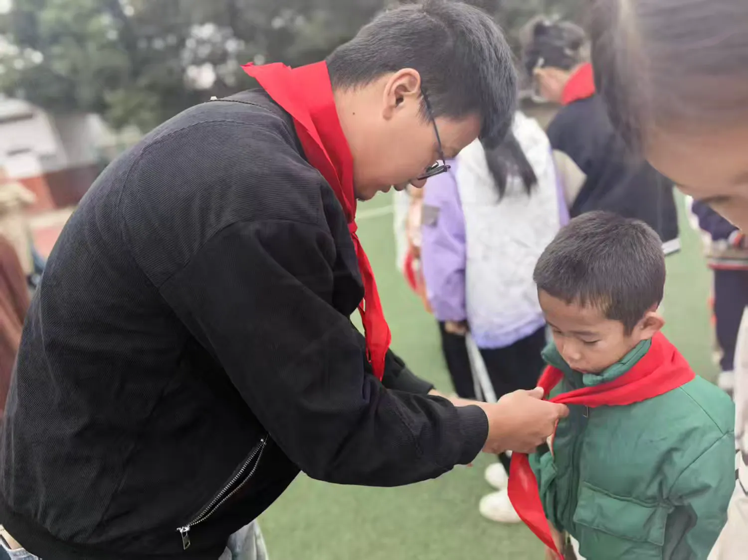 授红领巾环节中,校领导及老队员代表为新队员佩戴红领巾。老队员按照规范流程为新队员系好红领巾,新队员低头注视胸前的红领巾,完成佩戴后,新老队员相互敬礼,传递少先队的责任与使命。在辅导员的带领下,全体新队员面向队旗举起右拳庄严宣誓,誓词铿锵有力,展现出坚定的信念。