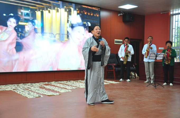 由弋阳县楹联诗词学余宾先生为现场带来李白《清平调二首》的吟唱表演,在金享良等乐手的管乐伴奏下,古韵悠悠、婉转悠扬,将在场众人带入盛唐的浪漫诗意情境中,赢得满堂喝彩。
