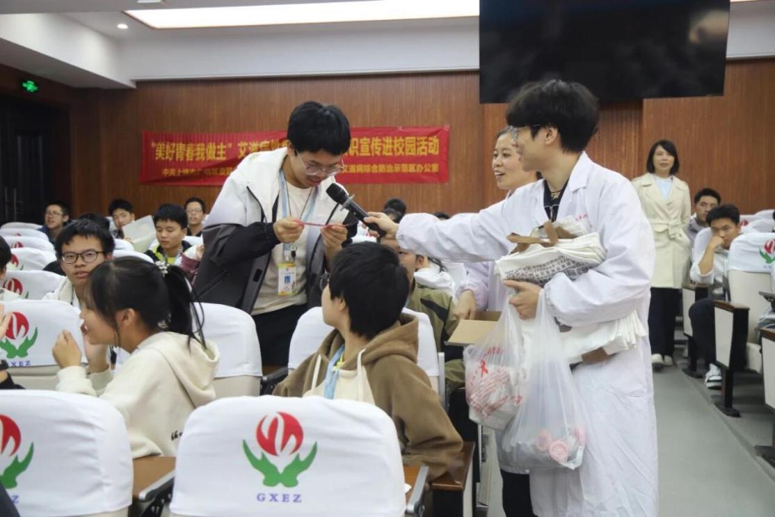 互动问答环节气氛热烈,同学们踊跃举手提问,区皮防所工作人员即时答疑解惑、纠正认知偏差,推动防艾知识真正入脑入心。讲座尾声,工作人员为参与学生发放红丝带徽章、防艾主题帆布袋等宣传品,让防艾知识与纪念意义深度融合。(王泽新)
