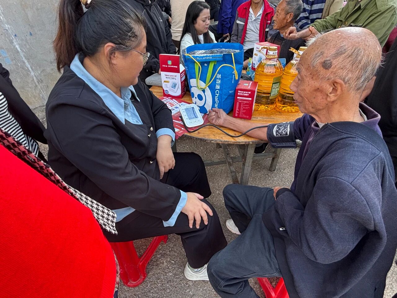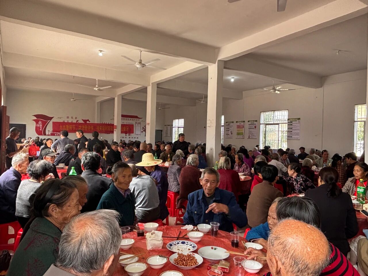 与此同时,黄墩村的爱老敬老活动也同样精彩纷呈,关爱备至。活动从清晨便已开始,传统的打糍粑活动让现场米香四溢,老人们重温了熟悉的传统技艺,也找回了往日的记忆。上午,村里组织了免费的血压测量和健康咨询活动,志愿者们耐心地为每一位老人检查身体,解答健康疑问,传递科学的养生知识,体现了对老人们身体健康的高度关注。到了中午,丰盛的重阳宴准时开席,老人们围坐桌旁,品尝着美味佳肴,相互举杯祝福,畅谈晚年生活。一整天的活动安排紧凑而充实,老人们的脸上始终洋溢着灿烂而幸福的笑容,沉浸在节日的喜悦与温暖之中。