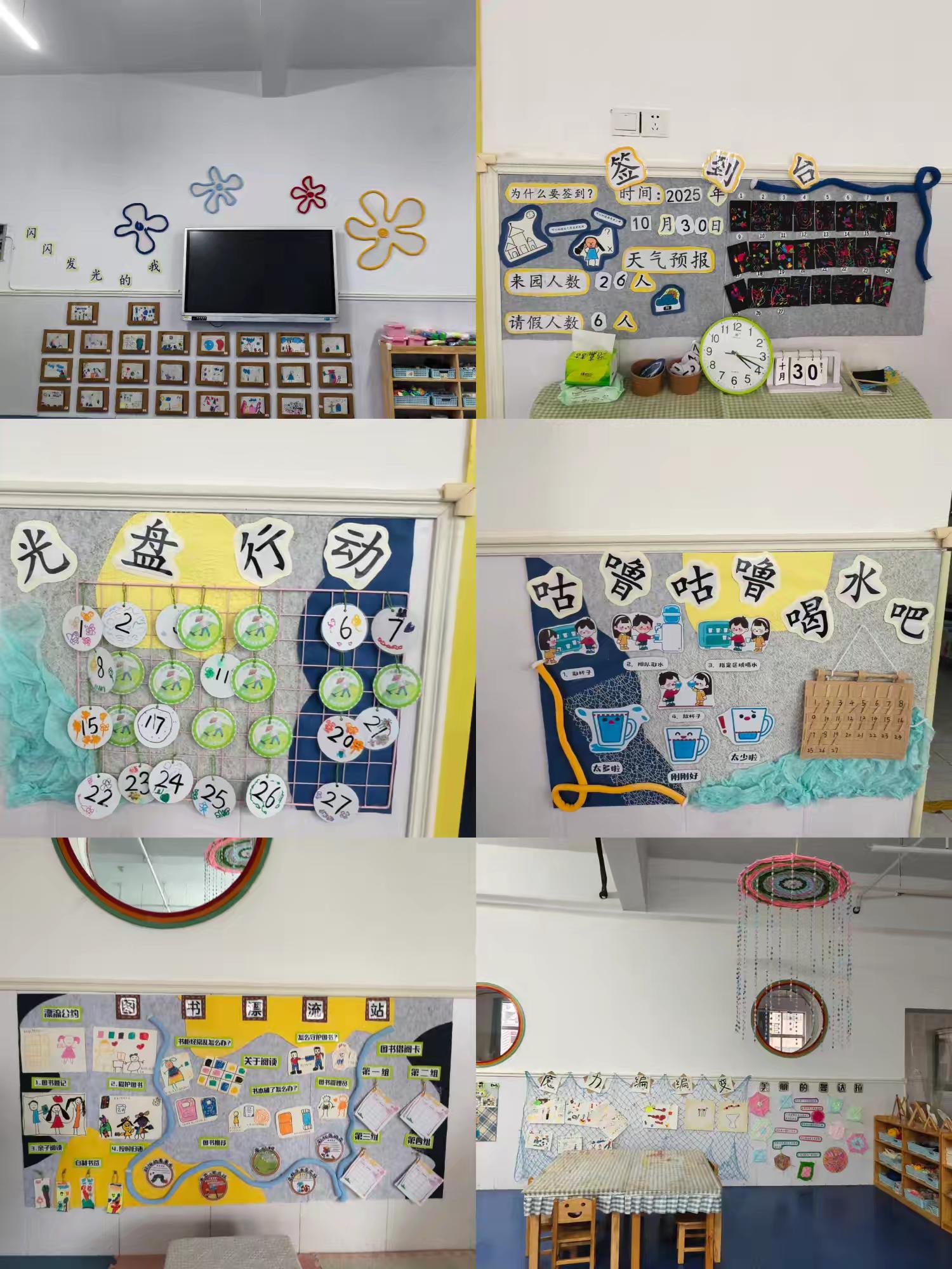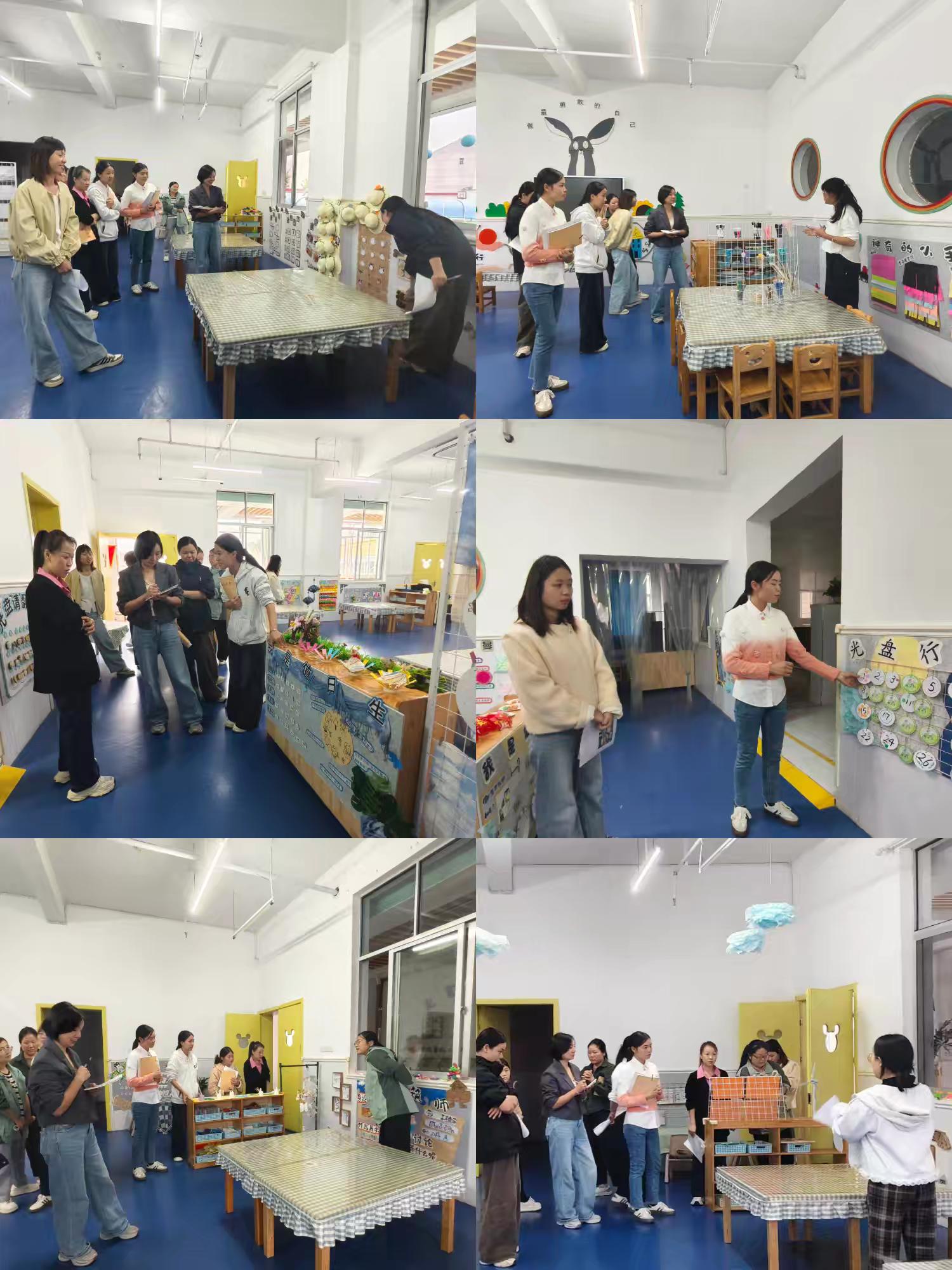 本次评比采用边走边讲的参观形式,各班老师化身讲解员,带着大家走进班级的喝水区、各个区域、光盘行动等每一处布置。她们细细分享环境创设的巧思、主题墙的设计亮点,以及藏在每一处细节里的教育用心——从理念到落地,从墙面到角落,让每一份环创都成为看得见的教育故事。
