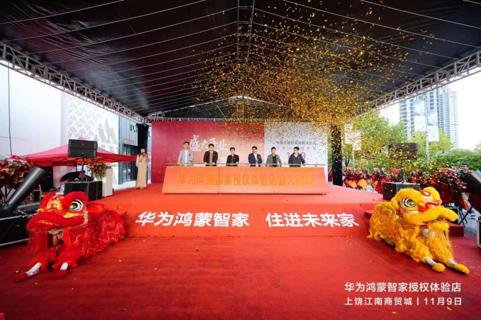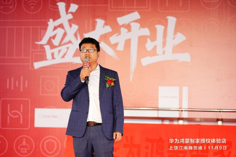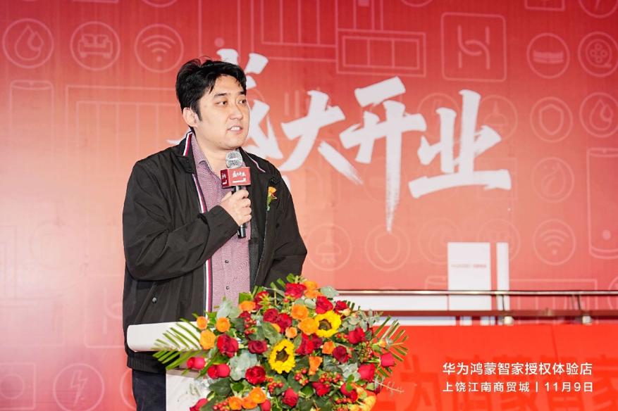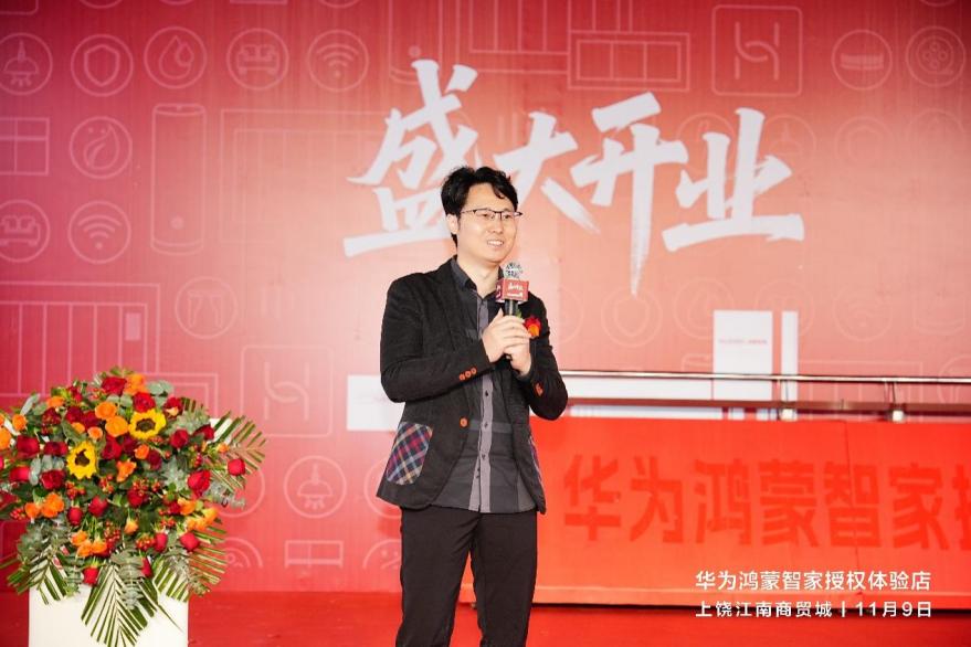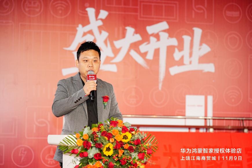华为江西终端业务部鸿蒙智家总监卢森林、上饶室内装饰协会会长张平、红星建材商管江西清缘商业管理有限公司总经理廖一成、华为鸿蒙智家授权体验店上饶江南商贸城店总经理孙健等相继上台做开业活动致辞发言