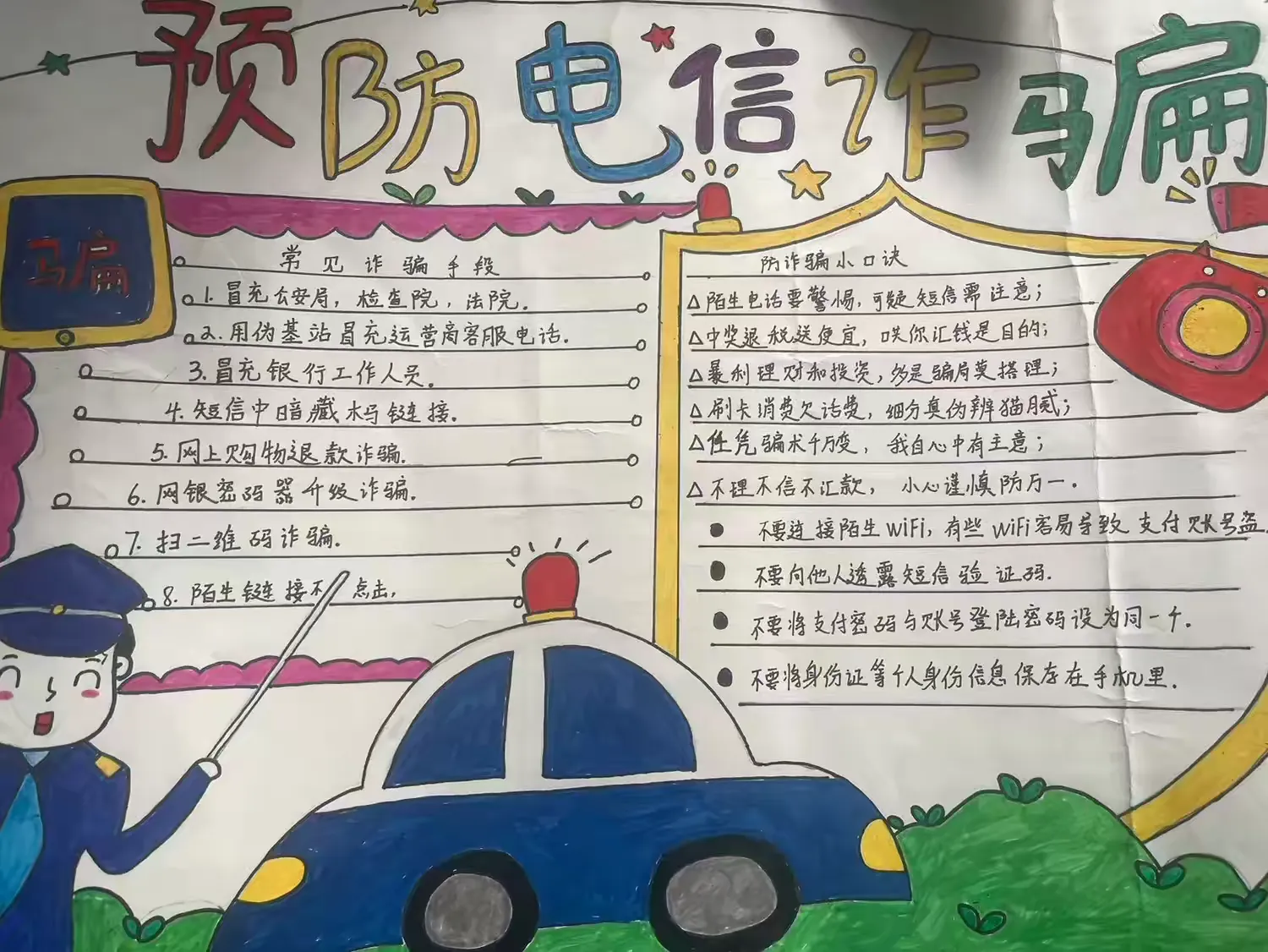 此外,学校还举办了高年级防电信诈骗手抄报比赛,获奖手抄报中,学生以丰富的色彩画出“冒充公检法”“网络刷单”等常见诈骗场景,搭配“陌生链接不点,不明转账不转”的标语,图文并茂又易懂;手抄报比赛不仅展现了学生的创意才华,更让反诈知识通过画笔深深扎根在孩子们心中。