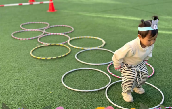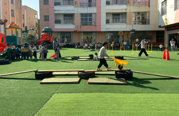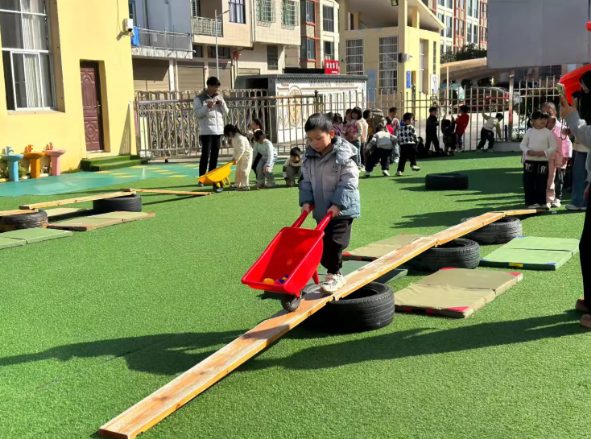运动会根据不同年龄段幼儿特点设计了六项特色赛事。小班萌娃化身“小刺猬”,顶着粘满“果子”的背板在障碍物间穿梭,《小刺猬运果子》游戏让孩子们在钻爬中提升肢体控制能力;《小熊过冬》则通过模仿小熊跳跃的动作,帮助幼儿掌握平衡技巧。中班的《雪地小骑兵》项目中,孩子们骑着平衡车飞驰而过,在起伏赛道上展现出色的平衡感;《龙虎争夺战》采用两两对抗模式,培养幼儿的竞争意识与规则观念。大班哥哥姐姐挑战《冬日运输队》,推着小车过独木桥、绕障碍跑,综合锻炼奔跑与平衡能力;压轴的《轮胎大力士》接力赛更是将气氛推向高潮,孩子们合作拖运轮胎穿越障碍,在呐喊助威声中体会团队协作的意义。