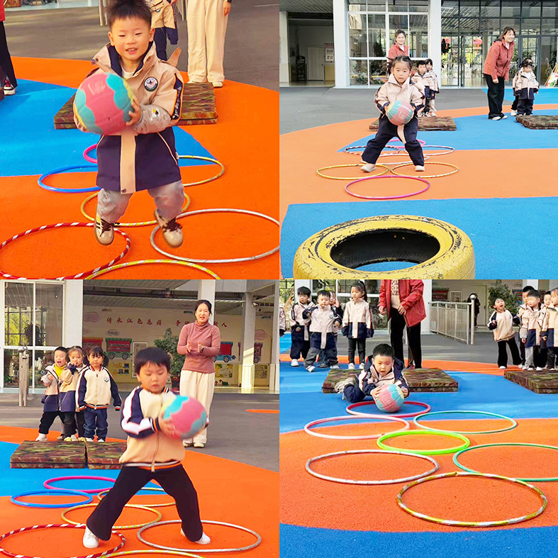 小班的竞赛以“轻松趣味”为核心,设置了“翻滚“呼啦圈跳”“趣味投掷”三个简单关卡。简单的挑战不仅锻炼了孩子们的肢体协调性,更让他们在游戏中建立了自信。