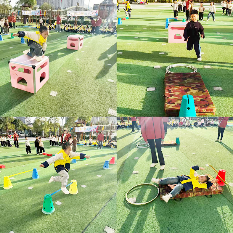 大班的竞赛难度升级,设置了“极速障碍赛”“翻越大山”“团队接力赛”三个高强度项目。“孩子们展现出超强的体能与反应力;大班孩子们奋勇争先,每一次冲刺、每一次突破,都赢得了全场的阵阵掌声。