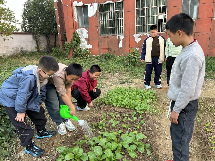 播种后,学生利用课余、午休及每周实践课轮流管护菜地。面对“分不清菜苗杂草”“浇水冲坏土壤”“施肥无度”等初期难题,劳动课教师化身“田间导师”现场教学:“菜苗叶椭圆光滑,杂草叶细长色深;浇水要沿根慢浇,避免淋叶生病。”经指导,学生们从“手忙脚乱”渐至“得心应手”,每日细致巡查、除草浇水,遇问题及时请教。