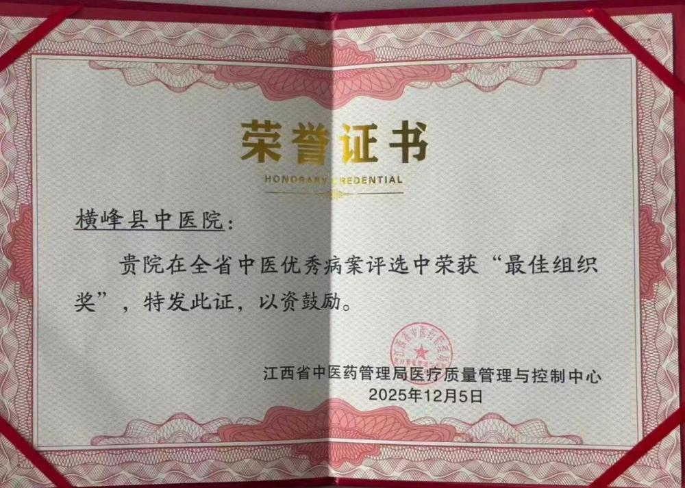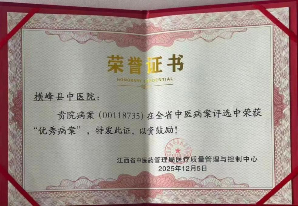 此次获奖是对医院中医医疗质量管理水平与人才专业素养的充分肯定。下一步,横峰县中医院将以此次评选为契机,进一步规范病历书写,强化中医临床诊疗规范化建设,持续提升医疗服务质量与水平,为广大患者提供更优质、更具特色的中医药健康服务。(黄悦)