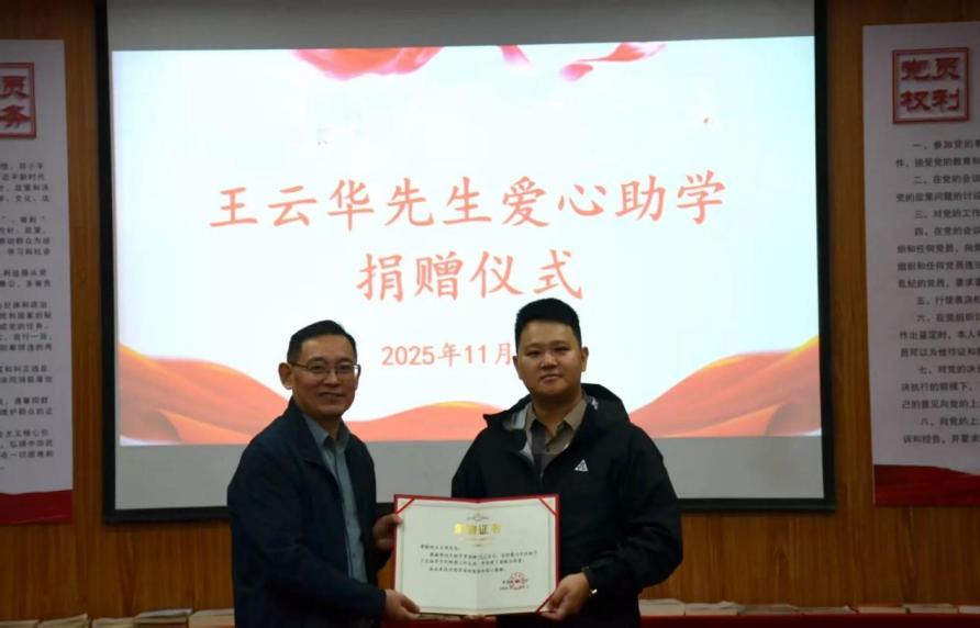 仪式上,学校相关领导领导代表全校师生对王云华先生的慷慨善举致以热烈欢迎和衷心感谢。他表示,此次捐赠不仅为贫困学子带来了物质上的帮扶,更传递了社会温情与关怀,为全校师生注入了精神动力,将激励学校持续深耕教育、培育栋梁。