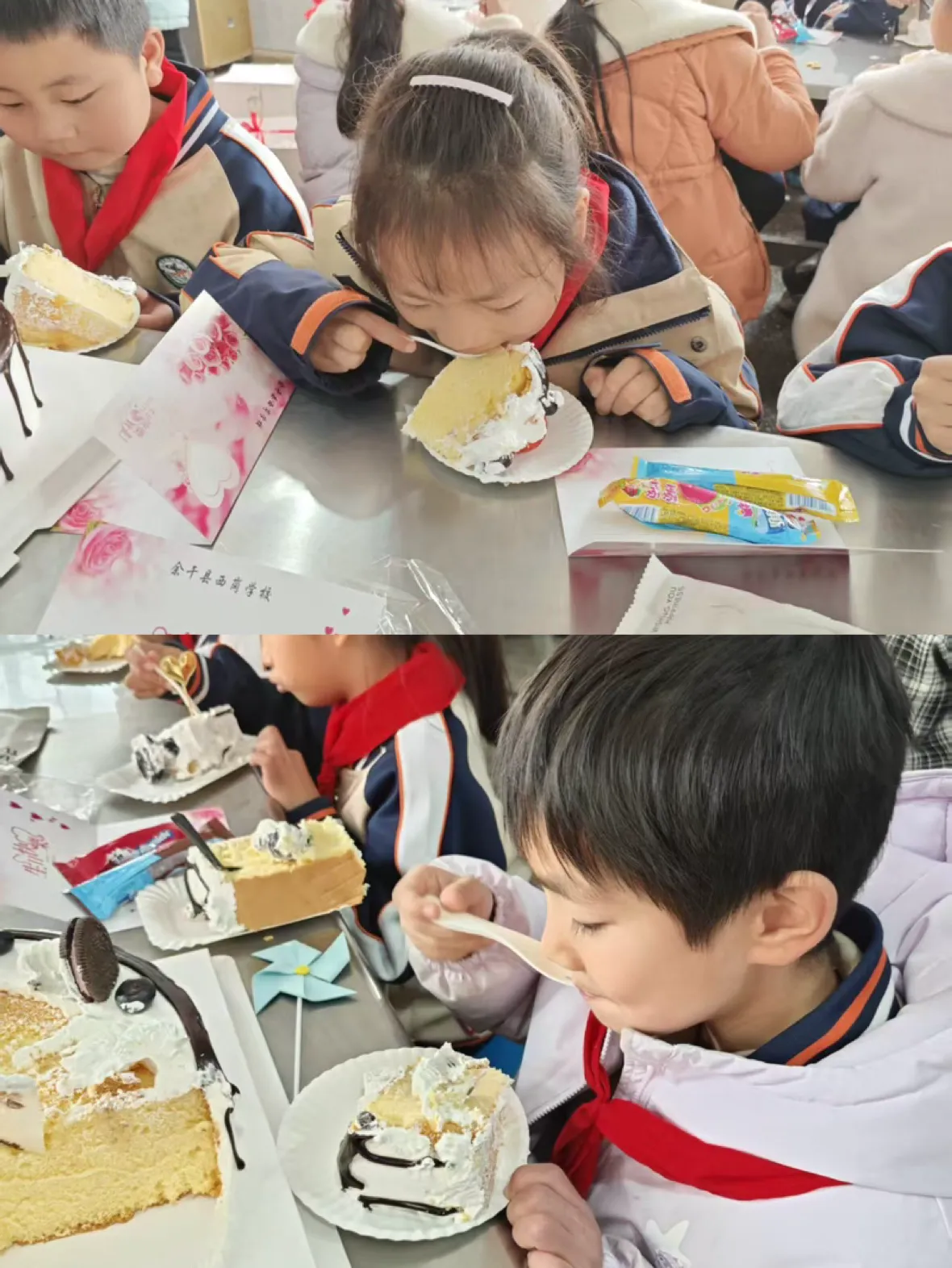 活动现场温情涌动,学生诵读致家长贺卡时的真情流露,引发亲子相拥的感人瞬间,深深感染在场众人。分发礼物环节,教师将糖果与贺卡送到学生手中,叮嘱孩子们将其中一颗糖果赠予家长,以文字传递感恩。随后,教师为“小寿星”们佩戴生日帽、分切分享生日蛋糕,温馨的生日歌声中,孩子们手捧甜蜜,笑容洋溢幸福。