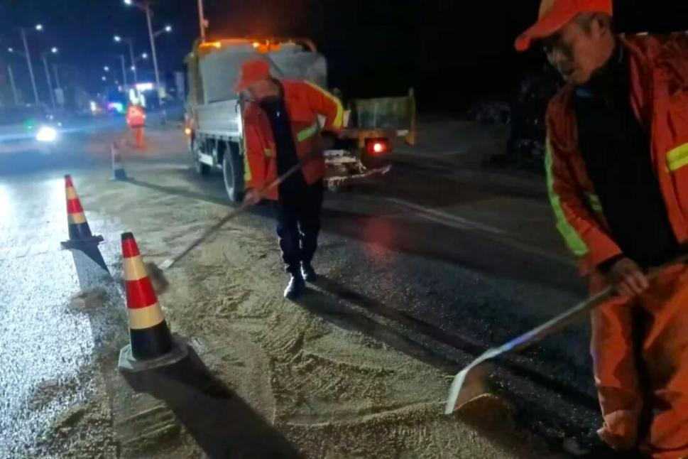 抢险人员抵达现场后,立即开展应急处置:在事发路段两端规范设置警示标志,引导过往车辆减速避让;同步采用铺洒沙子吸附油污的专业处置方式,待油污凝结后,使用扫帚、铁铲等工具对油污颗粒进行集中清理。深夜,寒风凛冽,身着橘红色工装的抢险人员顶风冒寒持续作业。经过一小时紧张处置,路面油污被彻底清理干净,该路段随即恢复正常通行,及时消除了道路安全隐患。