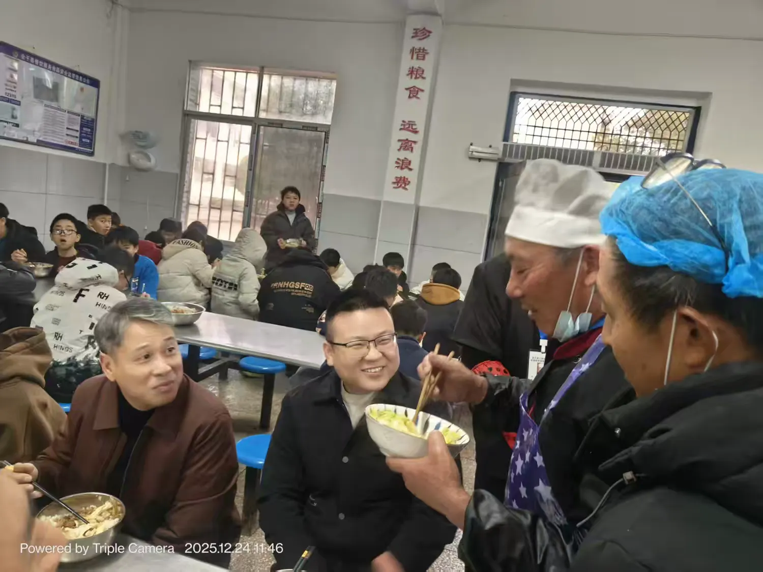 午餐时段,督导组成员留在食堂与学生们同坐共餐,亲切询问同学们对饭菜口味、分量、种类的意见建议,认真倾听学子心声,在轻松的用餐氛围中拉近了与师生的距离,也进一步掌握了食堂供餐的真实情况。