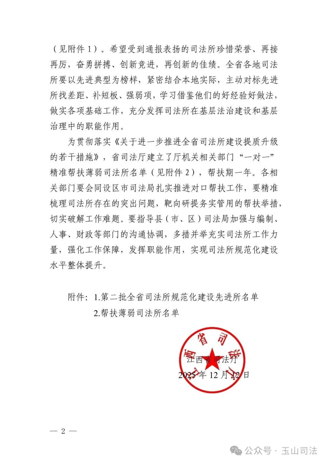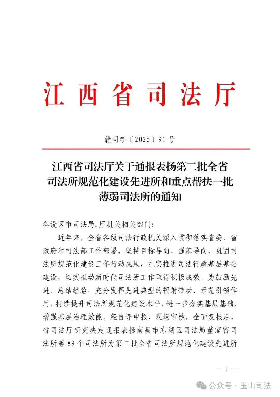 近日,在江西省司法厅印发的《江西省司法厅关于通报表扬第二批全省司法所规范化建设先进所和重点帮扶一批薄弱司法所的通知》中,玉山县司法局四股桥司法所获评全省司法所规范化建设先进所。(吴涵馨)
