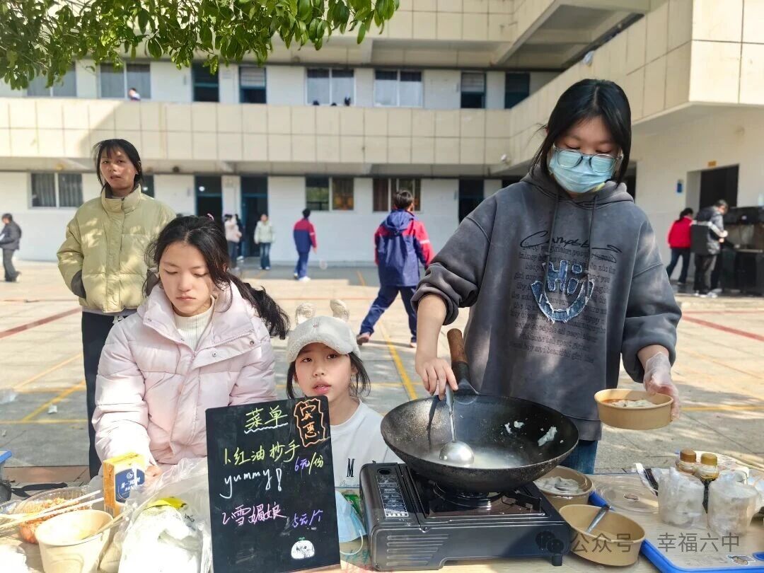 老师们也倾情参与其中,与同学们携手制作美食,班主任带领班级营造特色摊位氛围,将爱与温暖融入美食制作的每一个环节。现场香气四溢,特色小吃、创意甜点等各类美食琳琅满目,吸引师生纷纷驻足品尝、交流互动,喜悦之情溢于言表。
