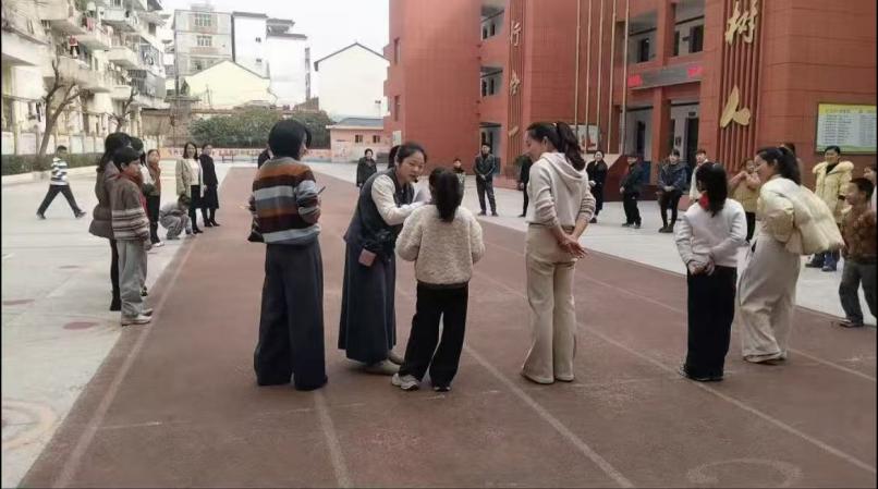 本次活动以拉近亲子距离、搭建心灵桥梁为目标,设置多项趣味互动环节。热身游戏《捉泥鳅》中,亲子手拉手围圈互动,在节奏中默契转身,迅速点燃氛围;“齐头并进”挑战里,亲子额头夹A4纸、双手背后闯关,低年级稳步配合、中高年级默契协作,尽显信任与包容;全员参与的“钻山洞”游戏,家庭手拉手搭起“爱心山洞”,家长贴心护佑低年级孩子,高年级同学主动提醒同伴,传递温暖与团结。