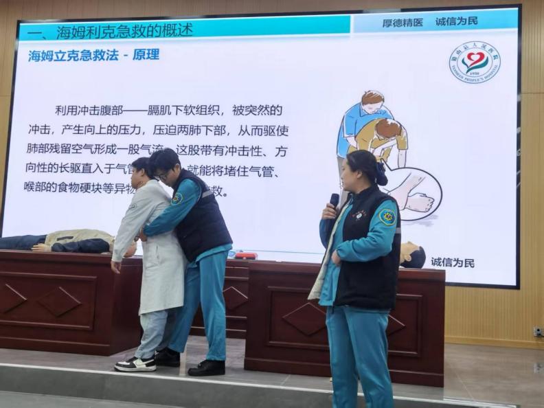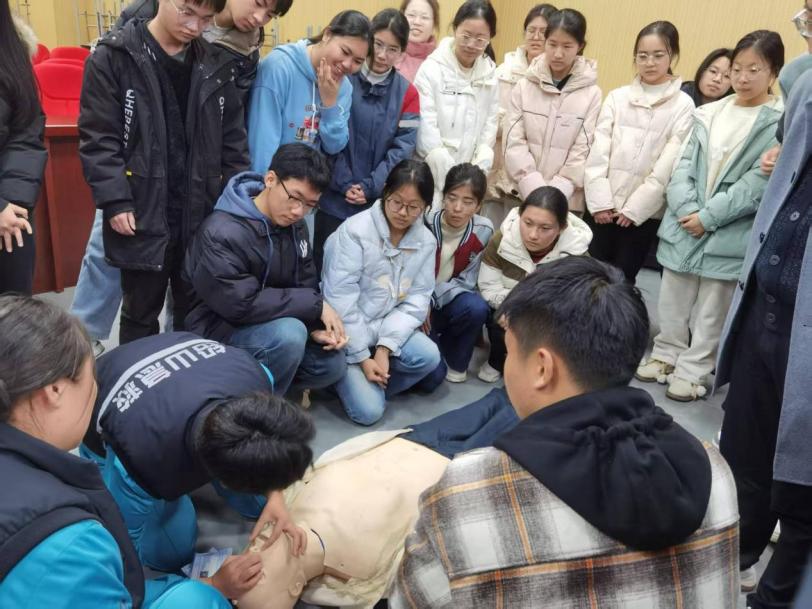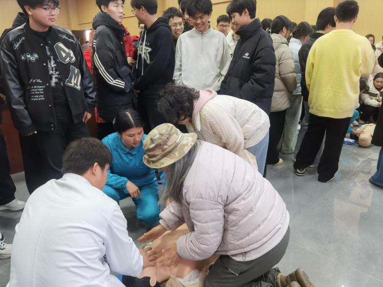 理论授课结束后,实操演练环节有序展开。中医院院区的医护团队化身“实操教练”,逐一示范胸外按压的手势、力度与节奏,开放气道的正确手法,以及人工呼吸的操作要领,每个动作都规范标准、讲解细致,确保师生们直观清晰地掌握操作细节。在医护人员的手把手指导下,同学们踊跃上前实操体验,认真模仿心肺复苏按压动作,反复感受发力部位与节奏把控;对于按压位置偏移、力度不足、频率过快等不规范问题,医护人员及时纠正,耐心解答大家的疑问。现场氛围热烈而有序,200余名师生通过“一看、二学、三练”的沉浸式学习,成功实现从理论认知到实操能力的转化,切实掌握了基础急救技能。