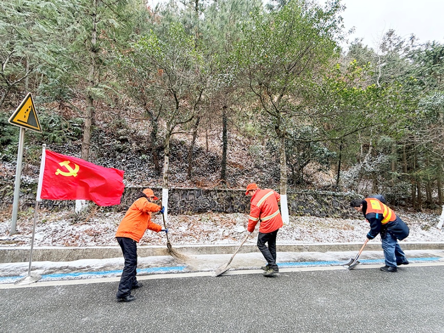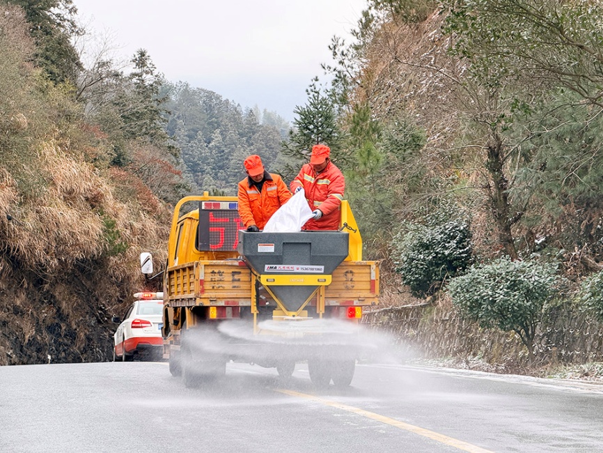 险情就是命令,畅通就是责任。上饶市三清山公路事业发展中心第一时间启动公路应急除冰预案,迅速集结养护职工、机关骨干共20人,组建应急抢通队伍,携带融雪剂、撒盐机等应急物资设备奔赴现场。现场累计出动应急抢险车辆4台、撒盐机1台,作业人员分工协作、高效联动,有序开展撒布融雪剂、破冰除障等作业,累计使用融雪剂2吨,全力清除路面冰雪。