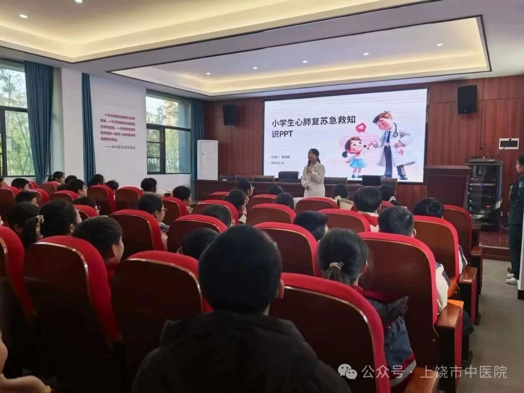 为响应“健康中国”战略号召,落实中小学急救教育相关部署, 1月19日下午,上饶市中医院急诊科骨干团队走进明叔小学,为六年级学生开展了一场以“听懂120的呼唤,掌握救命的技能”为主题的急救知识公益培训,以实操化教学为孩子们上好一堂“生命必修课”,让急救知识入脑入心。
